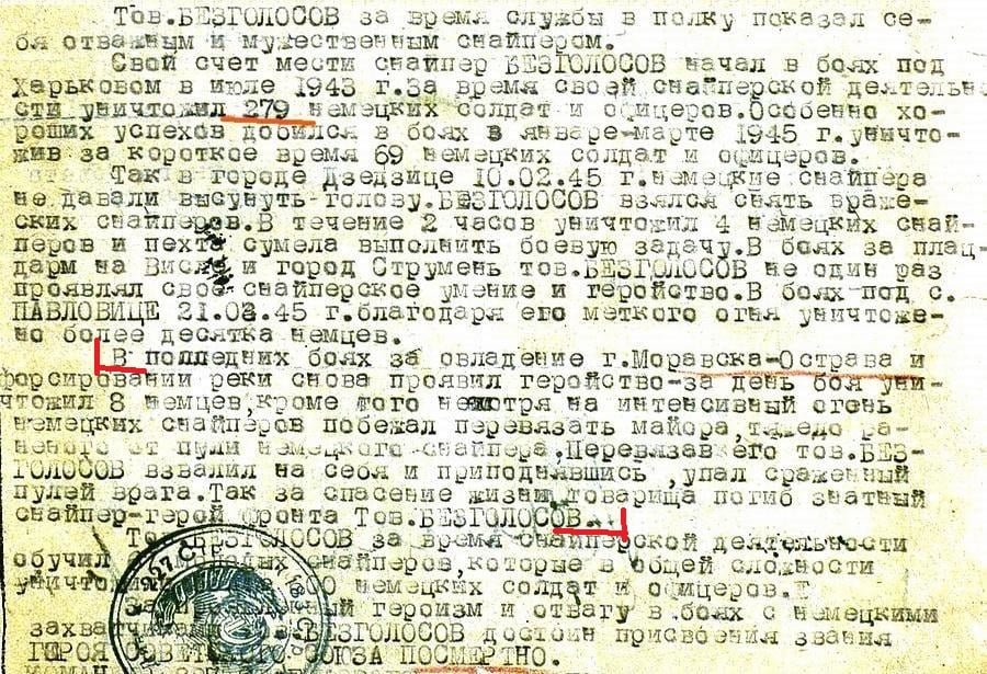 V rámci tzv. Ostravsko-opavské operace bojoval v řadách 4.Ukrajinského frontu 38. armády i jeden zapomenutý snajper, jeho celkové skóre činilo 279 zabitých nepřátel. Jmenoval se Vitalij Medofijevič Bezgolosov. Narodil se 20. května 1920 a pocházel z Kazachstánu. Do armády vstoupil v říjnu 1941. Na ...