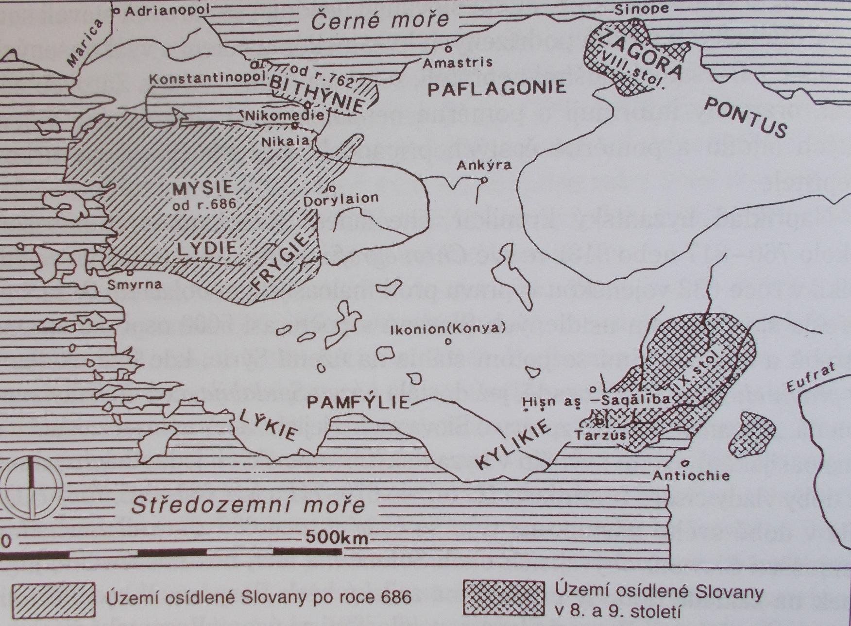 Slované se dostávali do Anatolie od 6. století, kdy Antové na svých monoxylech připlouvali po proudech řek do Černého moře, pak podél pobřeží i na jeho jižní maloasijský břeh a dokonce i na Dodekanéské ostrovy v Egejském moři. Hlavní vlna slovanských osadníků se do Asie však dostala masovou migrací řízenou státním aparátem Byzantské říše. Pro Byzanc to bylo výhodné, slovanští osadníci byli nejen činorodí zemědělci, ale také velmi dobří vojáci chránící své usedlosti před Araby. Zprávy arabských autorů, kteří se při svých nájezdech na východní hranici Byzance setkávali se slovanskými posádkami mluví o tom, že tito světlovlasí válečníci vzbuzovali v Arabech hrůzyplnou úctu. Na druhé straně nás však kronikáři informují o tom, že Slované často přecházeli na stranu nepřítele. V roce 633 podnikli Arabové velký nájezd do Malé Asie a 5000 zdejších slovanských osadníků se k nim přidalo a následně s ...