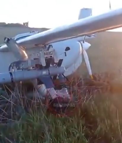 Průzkumný úderný bezpilotní letoun Mohajer-6 íránské výroby s řízenými střelami Ghaem-5, který spadl kdesi v Kurské oblasti v Rusku.