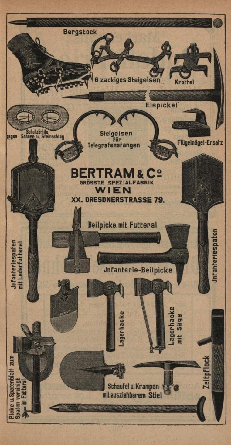 Stránka z oficiálního katalogu válečné výstavy Kriegsausstellung ve Vídni roku 1916. Zde konkrétně firmy BERTRAM a C., dodávající specializovanou výstroj pro c.a.k. armádu.