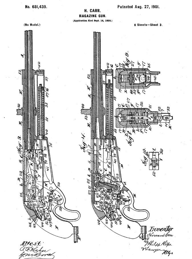 Na počátku 20. století, vznikl velice zajímavý kulomet který zkonstruoval Howard Carr ze San Franciska. Dne 14. dubna 1901, přišla na úřad námořnictva žádost o zkoušku nového kulometu. Žádost pocházel od společnosti Driggs-Seabury Gun and Ammunition Co., z New Yorku se sídlem na ulici Cedar Street 43. Vzhledem k tomu, že námořnictvo zbraň nepoptávalo a jednalo se o soukromou iniciativu podniku, bylo dohodnuto, že vláda sice poskytne munici na zkoušky, ale zaplatí ji výrobce zbraně. Zbraň byla komorována na náboj Krag–Jørgensen ráže .30 (7,62 mm). Tehdy se jednalo o první náboje plněné bezdýmým střelným prachem, zavedené americkou armádou. Pušky Krag–Jørgensen se v USA vyráběly v letech 1894 až 1904 ve zbrojovce Springfield v Massachusetts. Vyrobeno zde bylo zhruba půl milionu těchto zbraní a jednalo se o standardní zbraň americké námořní pěchoty té doby. Testovaná zbraň byla namontována na opěrce vybavené sedátkem pro obsluhu. Hlavní bylo možno vertikálně pohybovat pomocí šroubového závitu. Munice byla byla uložena v bubnovém zásobníku. ten byl rozdělen na 62 částí, v každé byly uloženy nad sebou čtyři náboje. Celkem tedy zásobník pojal 248 kusů munice. Výrobce ke zbrani přinesl i druhý zásobník na 310 ran, rozdělený na 5 částí. Pokud jde o samotný bubnový zásobník, tak s tímto konceptem přišel již Hiram Maxim, ale teprve Howard Carr se je poprvé pokoušel prakticky využít. Vlastní konstrukci zásobníku vyrobil v roce 1898 a nechal patentovat v roce 1901. Během vojskových zkoušek bylo prokázáno, že jednomu vojáku zabere doplnění munice do zásobníku 4 minuty a 45 sekund. Obsluhy testovaného kulometu se ujal samotný konstruktér a pro úvodní ukázku činnosti zbraně, vypálil 20 jednotlivých dávek a 20 ran dávkou. V této části zkoušek zbraň fungovala zcela bezchybně. Pro ukázku, jak rychle je možno zbraň sestavit v polních podmínkách, byl tento úkon zvládnut za 40 sekund. Dále bylo jednotlivě vystřeleno 17 kusů munice a 50 kusů dávkou. Během těchto zkoušek došlo k malé závadě pro ověření kvality munice, muselo být z pistole Colt vypáleno 100 kusů munice. Zkouška prokázala, že závada byla v samotném kulometu. Střelec ale závadu velice rychle opravil a dokázal zbraň rozebrat bez použití nástrojů. Vojáci požadovali zkušební vypálení 1 000 ran, což ale představovalo problém, jelikož hlaveň postrádala vodní chladící válec, který by umožnil takto vytrvalou střelbu. Výrobce požádal o odklad, než tyto problémy vyřeší. Druhá fáze testů byla zahájena 25. července 1901. Střelecké zkoušky nyní probíhaly uspokojivě. Za 35 sekund bylo vystřeleno 192 ran a za 40 sekund 240 nábojů. Kadence tedy byla vypočtena na 360 ran/min. Při zkouškách vytrvalé střelby, ale docházelo k přerušením tak často, že zkoušku nebylo možno uspokojivě dokončit. Problémem se ukázala být slabá pružina v zásobníku, která nedokázala efektivně vytlačit všechny náboje z bubnu. Projevily se i různé další problémy s odpalem munice. Pokud zbraň nebyla připevněna k držáku, těžký zásobník způsoboval, že bylo komplikované zacílit terč a zbraň byla považována za neohrabanou. Přehřívání při vytrvalé střelbě rovněž způsobilo, že ovládací mechanismus se zpomaloval a zasekával. Vedoucí důstojník - poručík Francis Broughton zhodnotil, že zbraň neprokázala požadované nároky na spolehlivost a zkoušku ukončil. Historie si tak musela na kulomet s plnohodnotným bubnovým zásobníkem několik let počkat, než byl představen lehký kulomet Lewis.