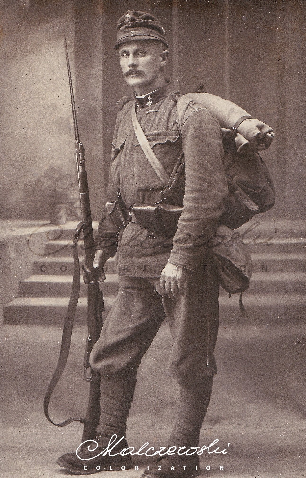 Rakousko-Uherský Landšturmák vyzbrojený kořistní ruskou puškou Mosin-Nagant model 1891 ráže 7,62 mm. Zde na fotografii z města Cetinje v Černé Hoře roku 1916.