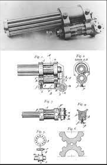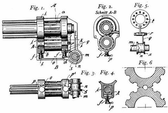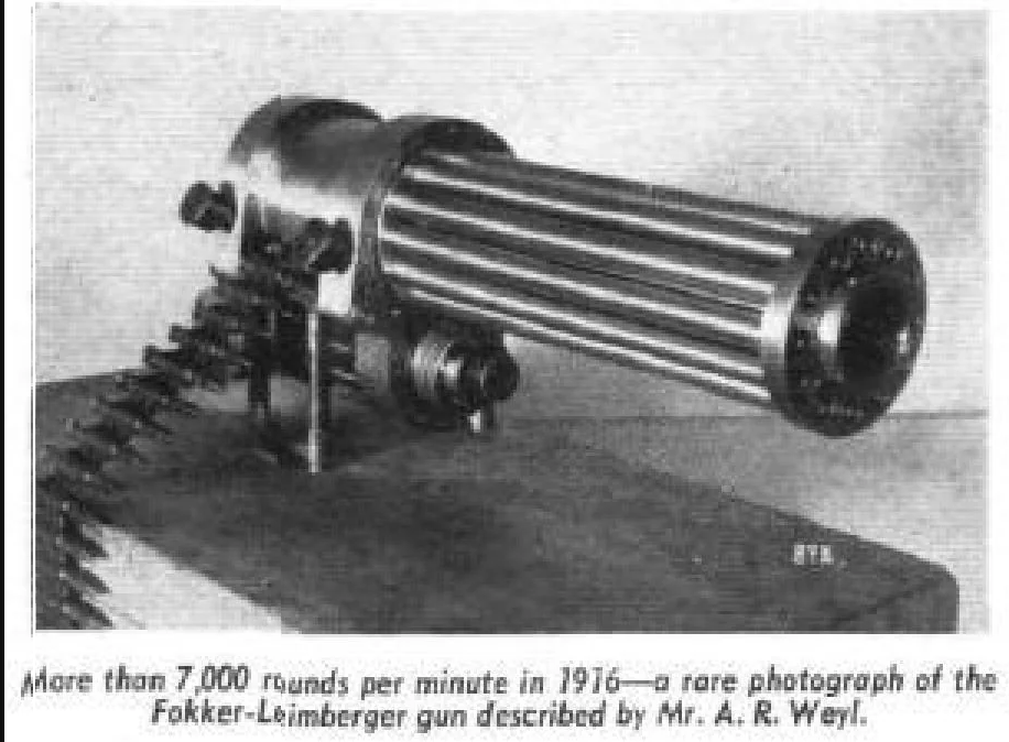 Při pátrání po dalších systémech synchronizace střelby okruhem vrtule jsem narazil na kulomet Fokker-Leimberger. Informace byly kusé - 1. světová válka, 12 hlavní, pohon elektromotorem, 7200 ran/min, nábojová komora skládající se ze dvou půlek; to zamezilo používání zbraně, protože v komoře praskaly nábojnice. Přitom jsem si vzpomněl na poznámku, že Gatling s elektromotorem (1893) střílel 3000 ran/min.