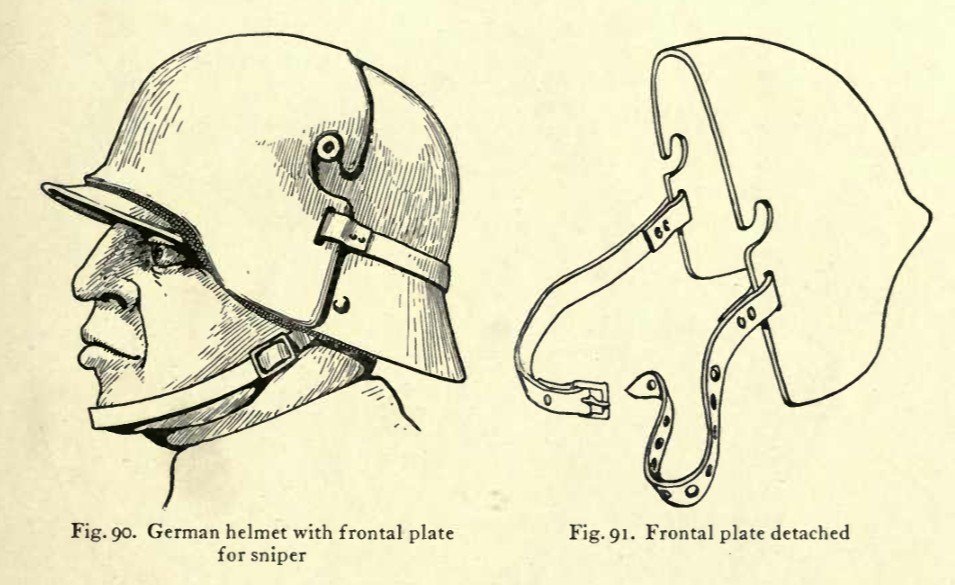 Na bocích přilby M1916 se nachází dva válcovité rohy, které plní jak funkci odvětrávací, tak i funkci úchytu pro speciální zesilující pancíř. Ze sedmi a půl milionu vyrobených přileb M1916, bylo jen 50.000 z nich možno osadit tímto představným pancířem. To znamená pouze každá stopadesátá přilba. Jak již bylo zmíněno, v přední části byl Stirnpanzer uchycen za samotné rohy a dále byl pancíř zajištěn koženým, nebo látkovým páskem, zachyceným za zadní část přilby. Materiálem k výrobě byl vysokokalený ocelový dílec šíře 6,3 mm. Podle některých údajů dokázala takto upravená přilba odolat palbě z pušky Lee-Enfield na vzdálenost 150 metrů. Váha tohoto zařízení byla lehce přes 3 kilogramy, mezi pěchotou nebyly z tohoto důvodu moc populární a výjimkou nebylo ani to, že byly vojáky po příchodě na frontu prostě zahozeny. Stirnpanzery byly primárně určeny pro statické jednotky, tedy pro hlídky, kulometné oddíly a odstřelovače. Podařilo se mi sehnat i fotografii poněkud prostěji tvarovaného Stirmpanzeru, konkrétně jen ohnutého dílce, doplněného o dva otvory k uchycení na přilbu. V roce 1917 se spojencům podařilo u Verdunu ukořistit velice netradiční německou přilbu. Jednalo se o těžkou přilbu, velice podobnou saským obléhacím přilbám z 16.století. Přilba měla dlouhé spodní lemy a krom výřezu v čelní části (podobného jako u M1916) byl druhý výřez pro krk. Zajímavé bylo též provedení vnitřního polstrování, které se odlišuje od toho u Stahlhelmu, v tomto případě bylo polstrování upevněné rovnou na přilbu a jednalo se o relativně tlustou prošívanou vrstvu, chránící hlavu. Přilbě také chyběly typické rohy na bocích zvonu a bylo zde patrno šest nýtů, kterými byly upevněna vnitřní výstelka. Tato přilba byla následně zaslána spolu s britskou vojenskou misí do New Yorku. Váha této přilby byla úctyhodných 6,35 kilogramu. Na 180 metrů dokázala tato přilba odolat palbě běžnou municí. V případě užití protipancéřové munice, bylo možno tuto přilbu prostřelit na obdobnou vzdálenost, leč je nutno zasáhnout přilbu pod vhodným úhlem. Britským jednotkám se podařilo v průběhu listopadu 1918, nalézt v obsazeném německém skladě v St. Mihiel další atypický typ přilby. Vzhledem se velice podobala modelu 1916, leč celková váha činila 1,36 kilogramu a byla tak o 140 gramů těžší než základní přilba. Tato přilba, někdy nazývaná model 1918, se vyznačovala také látkovým podbradníkem, oproti koženému jak tomu bylo u modelu 1916. Těmito pozoruhodnými přilbami a představnými pancéři ale výčet německých snah o ochranu hlavy bojujících vojáků, nekončil.