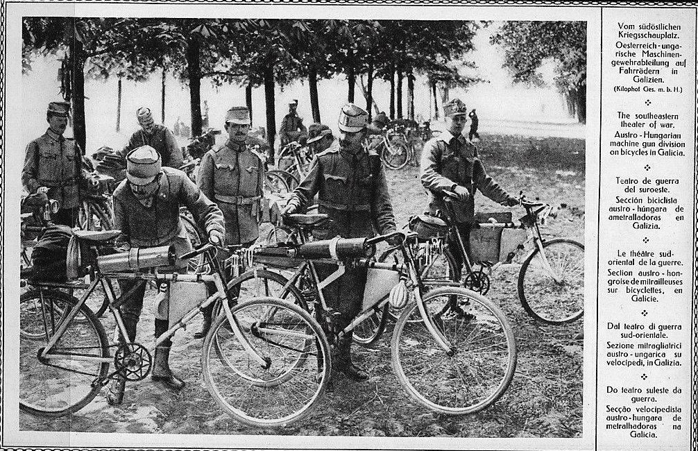 Rakousko-uherské oddělení strojních pušek (k.u.k. Maschinengewehrabteilung) při přesunu pomocí jízdních kol, konkrétně kdesi v Haliči.