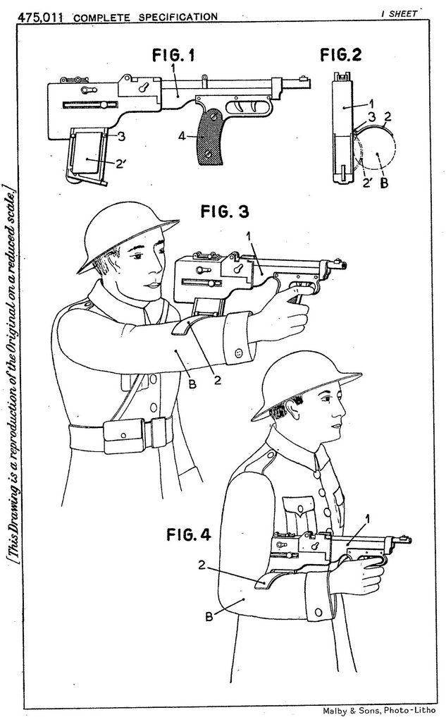 výkres Welshova patentu na jeho bullpup pistoli (1918)