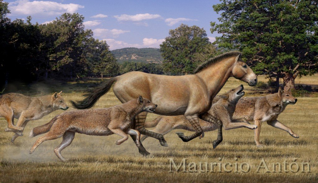 Rekonstrukce savany v západní Severní Americe asi před 15 miliony let, smečka Aelurodon ferox (Borophaginae) pronásleduje koně rodu Neohipparion. V takovéto otevřené krajině byli jak predátor tak kořist, nuceni zlepšovat svou výdrž a rychlost. Ilustrace Mauricio Antón.