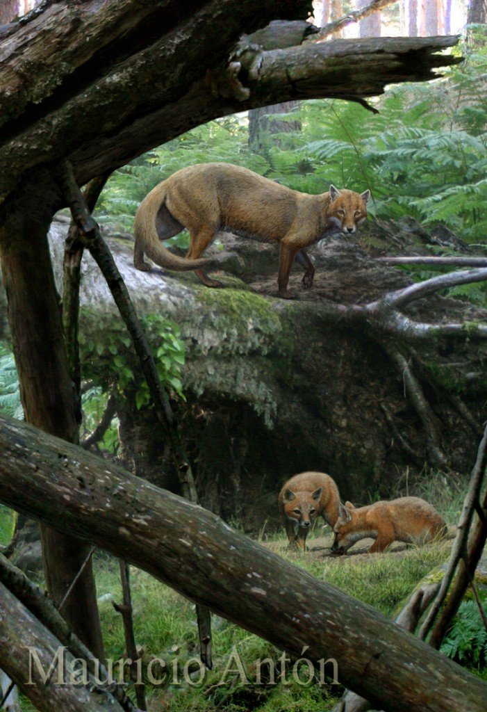 Mladý dospělý Eucyon davisi, o velikosti moderního kojota, přistupuje k jednomu ze svých rodičů v podřízené póze. Právě u tohoto rodu, který žil v Severní Americe asi před 9 až 5 miliony lety, se již objevovalo specifické chování, kdy tito mladí jedinci setrvávali na území rodičů a pomáhali pečovat o štěňata. Ilustrace Mauricio Antón.