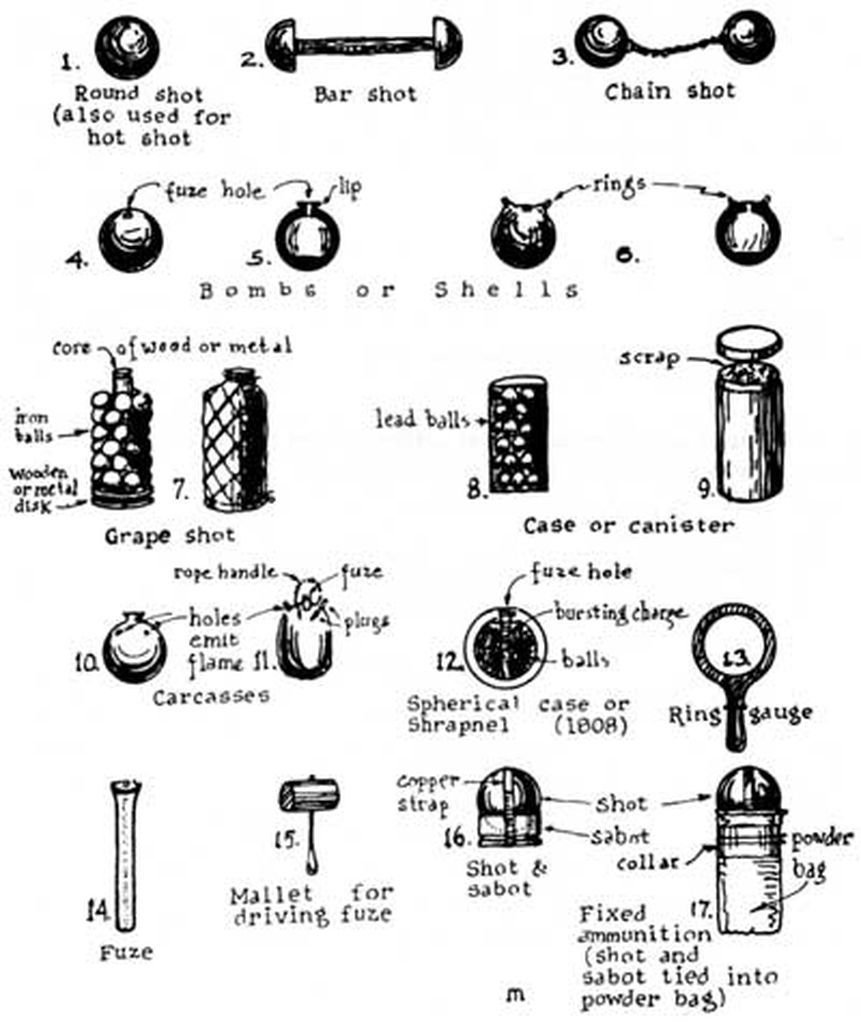 Během Americké války za nezávislost (1775-1783) používali dělostřelci k rozbití řad útočící pěchoty speciální munici zvanou grapeshot. Základ byl vyroben ze dřeva, kolem kterého byl kus pytloviny, vyplněné železnými kulemi. Z vnějšku bylo vše staženo motouzem a natřeno červenou oxidovou barvou, aby se zabránilo rezivění. Hotový produkt připomínal hrozen vína, což mu dalo i název. Při výstřelu z děla se vak a dřevěné části roztrhly a vyletěly z hlavně spolu s železnými koulemi, podobně jako při výstřelu hodně velké brokovnice. Efektivní dostřel grapeshotu byl kolem 300 yardů, tedy 275 metrů. Oproti klasickému kartáči zde měl být efekt poněkud opožděnější, díky čemuž se zvýšil dostřel. Oproti kartáči zde byly rovněž použity mnohem větší kule - u kartáče byly kule z mušket (někdy též sekané olovo, střepy, hřebíky i kamení) vsypány do jakýchsi plechové piksly nebo lepenkového obalu a kuželovitě se rozlétly ihned po výstřelu. U kartáče šlo ale v podstatě o munici "poslední záchrany" - k přímé ochraně samotného děla. U grapeshotu šlo ale o specializovanou munici s větším dosahem a hlavně vyšší průbojností (větší kule). Navíc je šlo vystřelovat horní skupinou úhlů, tedy i přes hradby a jiné překážky.