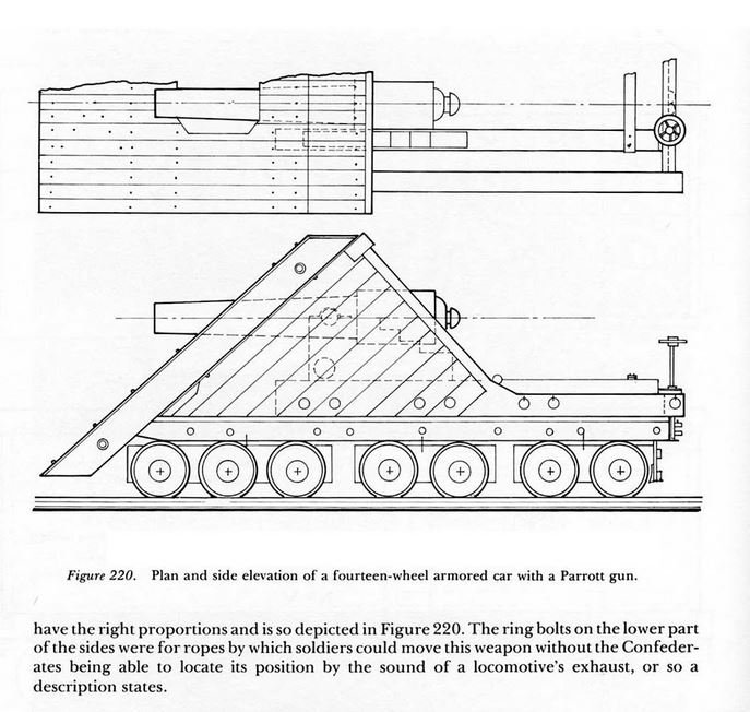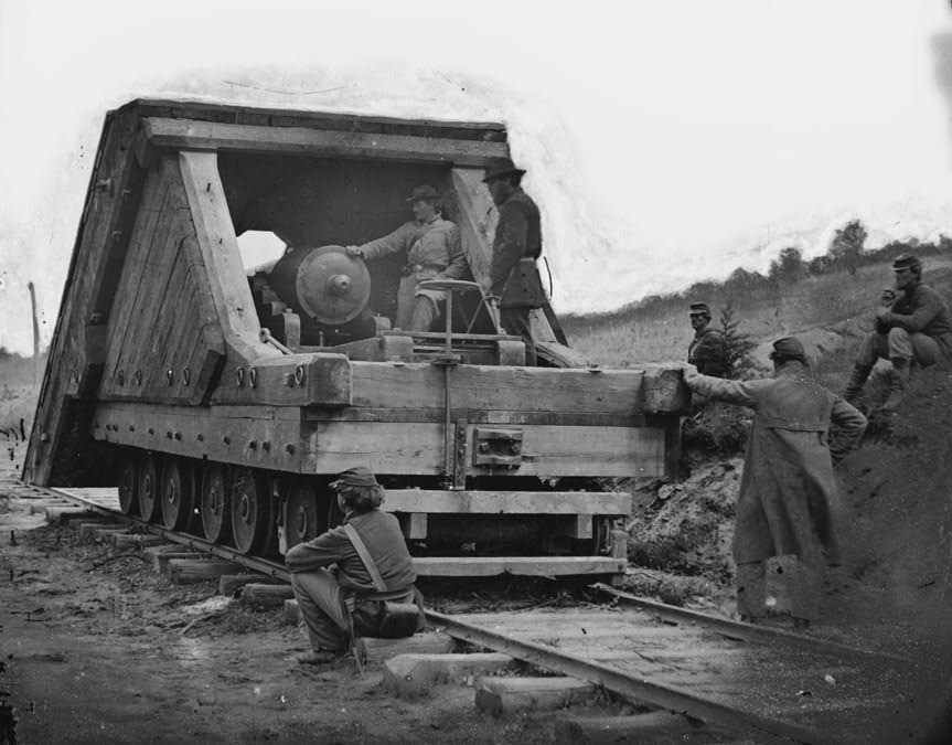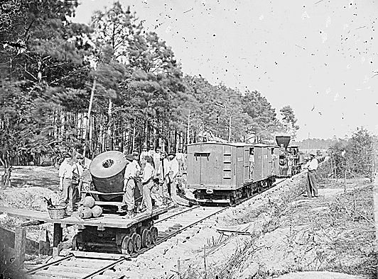 Myšlenka železničních děl se poprvé objevuje již roku 1847, kdy s návrhem přišel Gustav Kori a jeho koncept byl dál rozpracováván. Poprvé se objevuje v bojích americké občanské války. Jednalo se o námořní 32liberní dělo Brooke Banded Rifle namontované na plochém voze a chráněné šikmou kasematou vyrobenou z železničních pražců. Dne 29. června 1862 nechal Robert E. Lee vytlačit zbraň lokomotivou přes linii Richmond a York River (pozdější část jižní železnice) a použít ji v bitvě u stanice Savage, aby tak narušil plány generála George McClellana na obléhací operace proti Richmondu během postupu vojsk Unie po poloostrově. Během své kariéry si ono železniční dělo vysloužilo několik jmen včetně "Land Merrimack" nebo "Dry Land Merrimack". V současnosti se ale ustálil název Lee-Brooke Rail Gun, na základě výzkumu doktora Davida H. Schneidera. Bylo ukořistěno jednotkami Unie při obléhání Petersburgu. Použité 32liberní dělo je samo o sobě poměrně vzácné, byť několik těchto kusů se zachovalo až do dnešní doby. Jeden je ve Washington Navy Yard, byl ukořistěn ve Fort DeRussey v Louisianě.