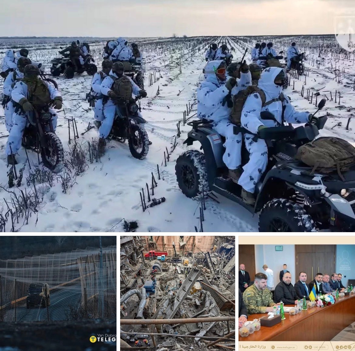 Foto: Ukrajinci na motorkách. | Frontová logistika. | Kyjevská elektrárna po náletech. | Jednání v SAE.