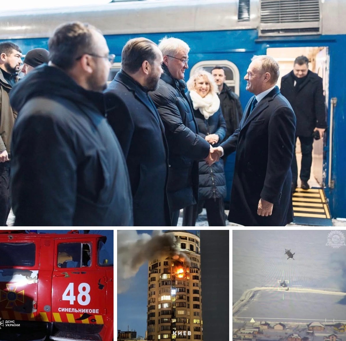 Foto: Polská delegace je v Kyjevě. | Zasažení hasiči. | Kyjev. | Moment těsně před tím, než ruská raketa zasáhla ukrajinský dron.