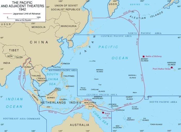 Pacifik, skica prostoru z roku 1942, kde se odehrávali popisované boje i v roce 1944, skica je majetkem Wikipedie, zde byla zmenšena.