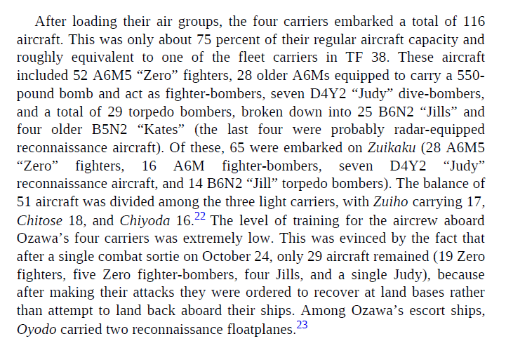 Prošel jsem většinu zdrojů, které mám po ruce, a jediný kdo uvádí rozdělení ledadel na jednotlivé lodě zařazené do Ózawova Severního svazu je Mark Stille. Ten uvádí, že na Zuikaku bylo 65 letadel, na Zuihó 17, na Čitose 18 a Čijoda nesla jenom 16 letadel, což je dohromady těch 116 letadel, které uvádí většina zdrojů. Už si nevzpomínám kde jsem ta původní čísla vzal, ale evidentně to jsou chybné údaje, takže to později upravím podle toho co uvádí Stille.