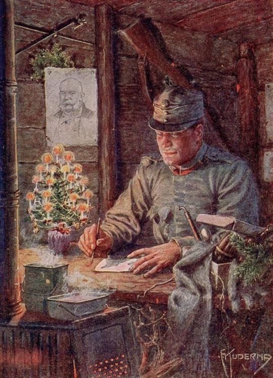 (Z dopisu českého šikovatele) Milá Fanči! Abys měla aspoň ponětí, jak užili jsme svátků vánočních, posílám Ti malý obrázek. Na Štědrý den bylo prabídně. Mlha zahalovala celý kraj svým šedým závojem, takže nebylo vůbec možno po krajině se rozhlédnouti. K tomu bylo všude plno bláta a vody a déšť visel nad hlavou. Byl jsem po celé svátky k své veliké radosti pod střechou, takže ta psota venku na mne příliš nedoléhala. Po silnici kolem se vinoucí po celý den nepřetržitě hrčely povozy sem tam, na kterých bělaly se balíky, bedničky a bílé pytlíky vánočních darů, určené pro naše válečníky. Všude bylo možno pozorovati jakýsi ruch, ne snad, že by jej byl nepřítel způsobil, nýbrž každý, kdo byl nucen o Štědrém večeru zůstati venku, připravoval si svůj stánek, jak mohl nejlépe. Tu nesl vousatý artilerák sáhodlouhé prkno na střechu svého budoucího boudoiru, tam opět kráčel a ohýbal se pod otepemi slámy vojín, od lesa spěchalo s celými smrky a jedlemi několik "furvezňáků", po silnici ubíralo se několik malých koníků, vlekoucích na svých bedrech zásoby paliva z lesa na večer, zkrátka všude byl shon a každý snažil se svůj koutek co nejlépe a pohodlně si upraviti.V táboře zatím připravovaly se stromečky: celé smrky nebo jedle; ozdobovali je staří tatíci a zajímavý byl na ně pohled! Zatím přiblížil se večer. Byly rozdělány ohně a podána večeře, sestávající z jaternicové polévky, jaternic, uzeného masa, kávy, vánoček a čaje. Každý byl pak podělen jablky a cigaretami. Z celého večera byl nejdojímavější moment, když hoši zazpívali o půlnoci: "Nesem vám novin". Ozvěna lesní nám přinesla jako pozdrav ze svého nitra.