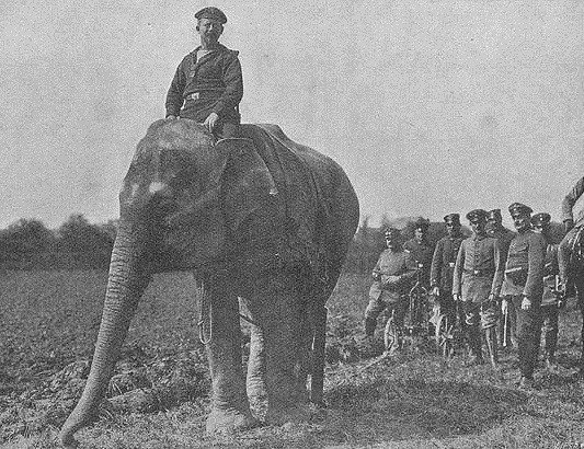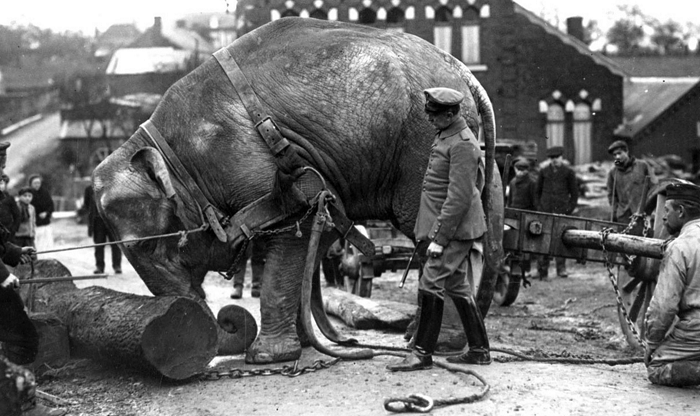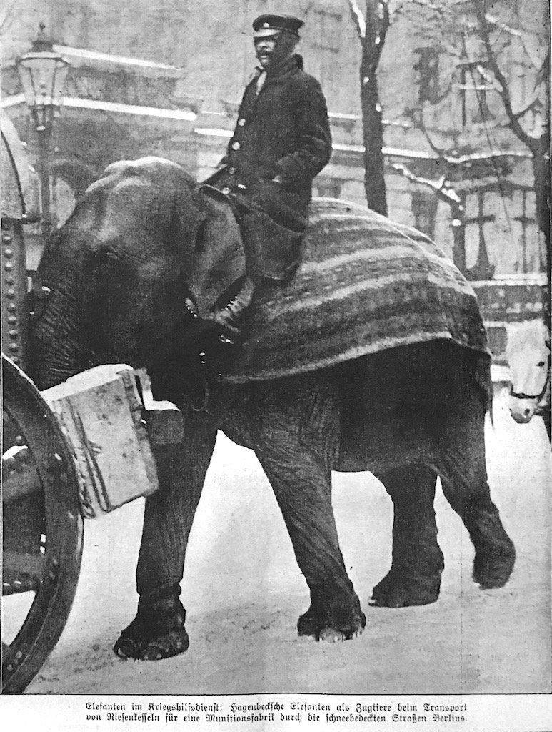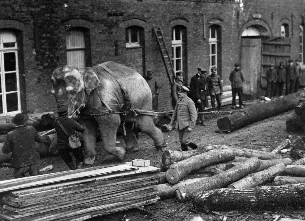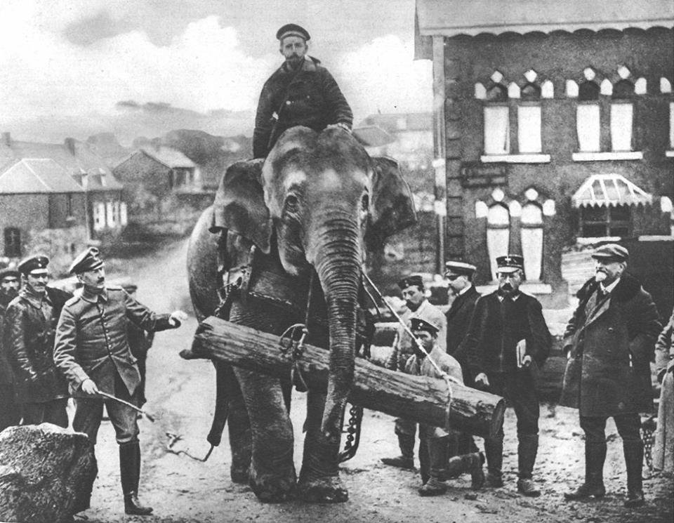 Když odešli v roce 1914 koně do války, jejich místo občas zastoupili sloni. V zázemí na obou stranách fronty, tak bylo možno vidět při práci cirkusové slony, kteří se zapojili do válečného úsilí. Často jsou známa jejich jména (Lizzie, Kiri atd.) a staly se oblíbeným tématem propagandy. Většinou je můžeme vidět při orání polí, nošení klád a podobných těžkých břemen. Ve válce zkrátka každý musel přiložit ruku k dílu, nebo chobot.