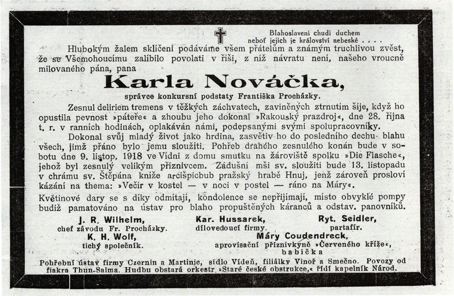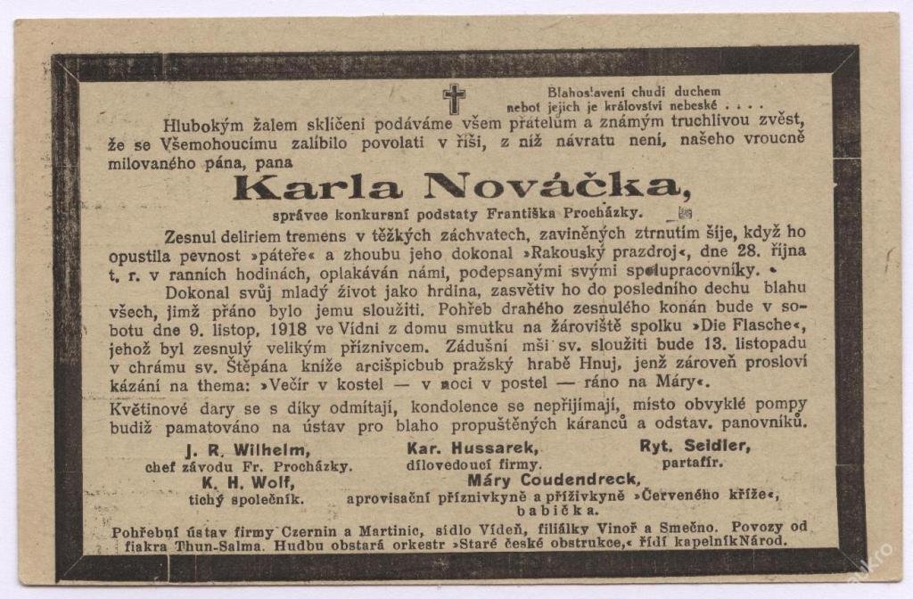 botu dne 9. listop. 1918 ve Vídni z domu smutku na žároviště spolku "Die Flasche",