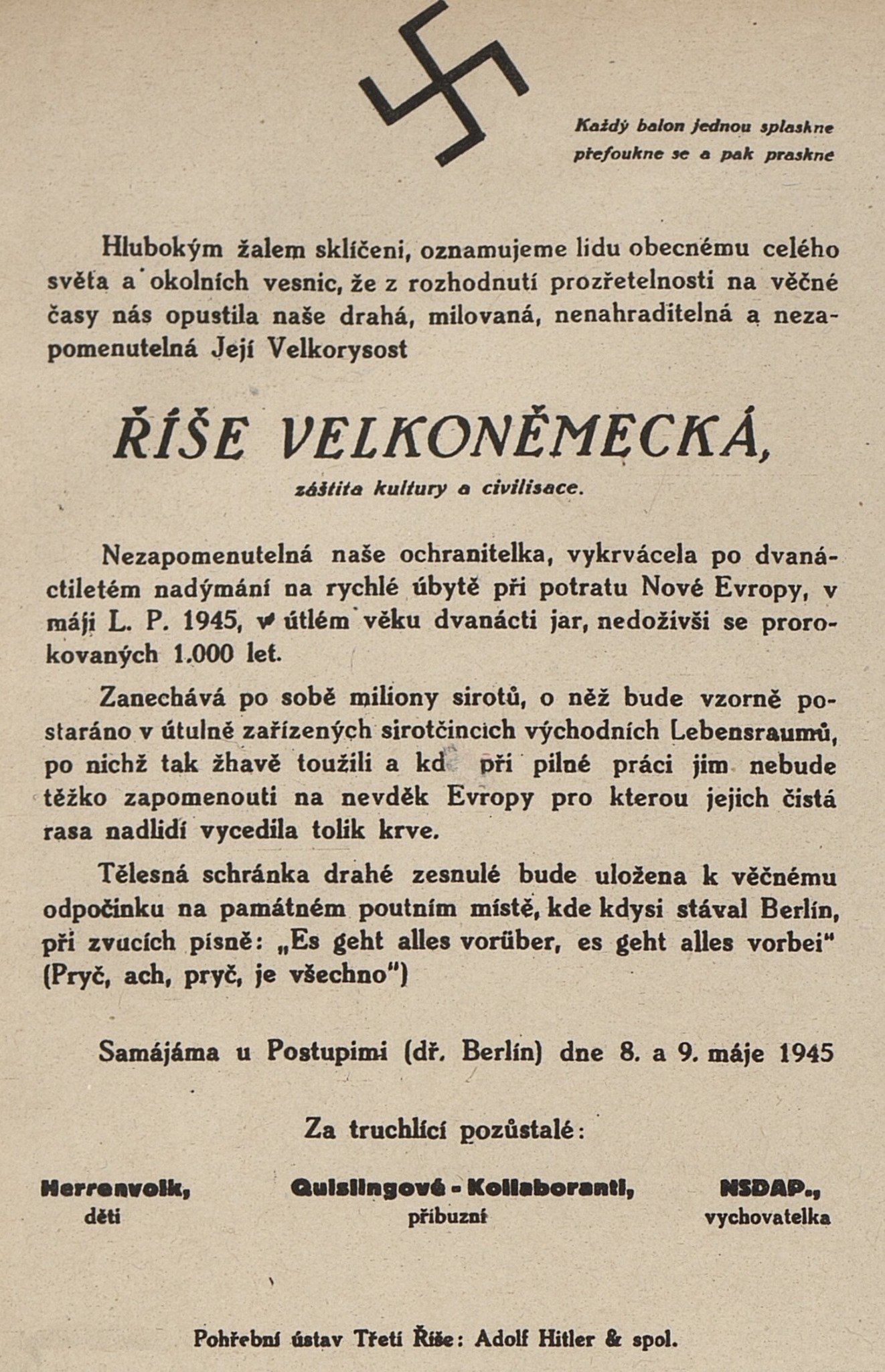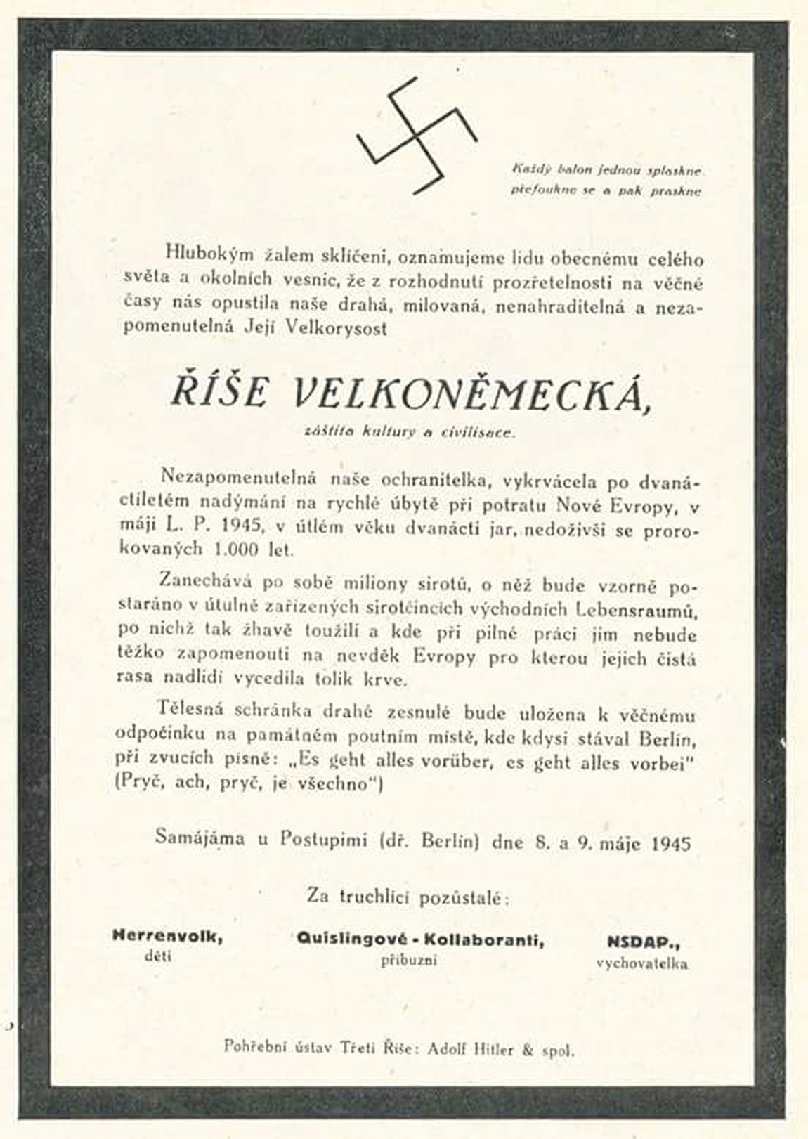 Rase píše:Jelikož se jedná o takový "Český" fenomén, tak přidám i úmrtní oznámení Třetí Říše, které je psáno ve stejném duchu jako úmrtní oznámení R-U.