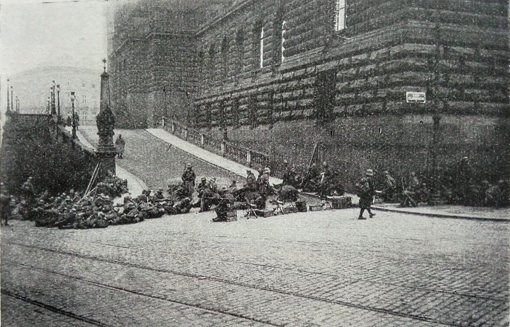 Jedním z posledních neuralgických bodů rozpadajícího se mocnářství v Praze bylo c. a k. vojenské velitelství VIII. armádního sboru. Právě z tohoto místa mohl vzejít impuls, posouvající doposud v poklidu probíhající převrat na jinou úroveň. Právě s vědomím tohoto rizika vešel ČNV urychleně v jednání s velitelem vojenského velitelství generálem Paulem Kestřankem. V rámci těchto počátečních rozhovorů hrála svoji nezastupitelnou roli sokolská stráž, chytře umístěná k hlavnímu vchodu velitelství. Nicméně o půl noci z 28. na 29. října došlo k zásadní změně situace. Na aktuální dění pomalu rezignující generál Kestřanek byl nahrazen plukovníkem Stuschkem, jenž našel oporu v tvrdém „ monarchistickém“ jádru důstojníků. Oproti svému veliteli, byl náčelník štábu Stuschke poněkud jiný formát, když k zabezpečení velitelství si neprodleně vyžádal pomoc od pražské posádky v podobě asistenčního oddílu 51. pěšího pluku. Příchod 250 vojáků s helmami a kulomety, zvrátil momentální situaci na stranu monarchistů, přičemž následné vytlačení sokolů mimo objekt velitelství bylo otázkou okamžiku. Zpráva o změně poměrů dorazila k Rošickému na Žofínský ostrov ve večerních hodinách 29. října. Na místo byla promptně vyslána stovka námořníků, nazývaná již jako 1. setnina námořníků (por. Kubát) s rozkazem zabezpečit blízké okolí velitelství. Chvilku po půl noci byl úkol splněn a zároveň došlo k posílení skupiny dalšími 40-ti čerstvě přihlásivšími se mariňáky. Za těchto okolností, začalo v 8:30 ráno další kolo vyjednávání, na jehož pozadí přítomní Češi bez okolků apelovali na příslušníky maďarského asistenčního oddílu2). Postupem času české „vandrování“ do asistence začalo přinášet své plody, několik vojáků odložilo své zbraně a někteří začali po anglicku mizet. Tohoto posunu si ihned všimli námořníci, kteří bez rozpaků vtrhli do budovy velitelství, kde rychle odzbrojili zbývající členy asistenčního oddílu a ovládli tak přízemí budovy. V prvním patře několik rakousko-uherských důstojníků v očekávání útoku tasilo šavle, nicméně zbytečnému krveprolití zabránil v hodině dvanácté příchod dalších čs. posil. Ideálně načasovaný příchod Rošickým vyslané dobrovolnické setniny ze Žofína, tak de facto zlomil poslední zbytky vůle k odporu a bylo dobojováno.