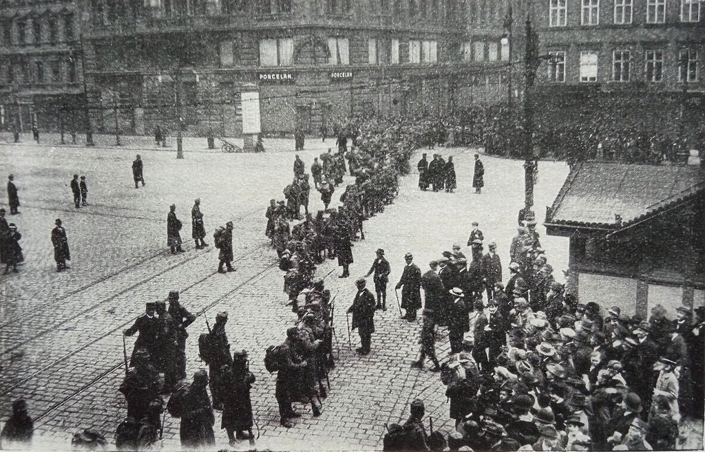 Dne 14. října 1918 vyvrcholilo v Praze a v Čechách vůbec demonstrační stávkové hnutí českého dělnictva, které počalo 22. ledna 1918 a jehož přední příčinou byla hmotná bída a naprostý nedostatek potravin v širokých vrstvách lidu. 14. říjen byl vůbec jakousi generální zkouškou k 28. říjnu. Tato zkouška se neomezila jen na Prahu, nýbrž byla provedena i ve značné části českých měst, v nichž se konaly protestní tábory. Jedině v Písku byl proveden skutečný převrat pod vlivem podvrženého telegramu o prohlášení československé republiky a radostný den svobody byl tu oslaven o čtrnáct dní dříve, než opravdu přišel. Také ve Strakonicích pak obecní strážník podle starobylého zvyku vybubnoval odpoledne 14. října, že v Praze byla prohlášena československá republika. O této stávkové demonstraci dozvědělo se neprodleně i pražské místodržitelství a vojenské velitelství, které se souhlasem Vídně rozhodly potlačiti v Praze demonstraci vojenskou mocí. Poněvadž při přípravách úřadů se objevilo, že valná část pražské policie jest nespolehlivá, bylo shromážděno do Prahy na půl tisíce četníků a pražská vojenská posádka byla z Litoměřic zesílena asi dvěma tisíci německých a maďarských vojáků. Časně zrána obsadily kordony vojska se strojními puškami všechny ulice a křižovatky, které vedly z pražských předměstí do vnitřního města, aby znemožnily všem vstup do pražských ulic a zejména na Staroměstské náměstí, kde se měl konati o 11. hodině dopolední manifestační tábor. Staroměstské náměstí a Václavské náměstí byla vyklizena. Praha se proměnila ve vojenský tábor, všude vojáci, složené pušky v pyramidách a polní vojenské kuchyně.