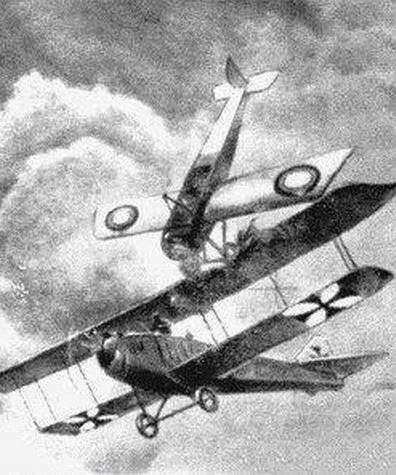Domnívám se, že je to skutečně první taran v dějinách letectví. Já o něm poprvé četl v beletrii, tedy v Příběhu opravdového člověka. Je jasné že tudy cesta k leteckým bitvám budoucnosti nevedla, ale komu čest tomu čest. Asi stím že to sám nepřežije nepočítal.