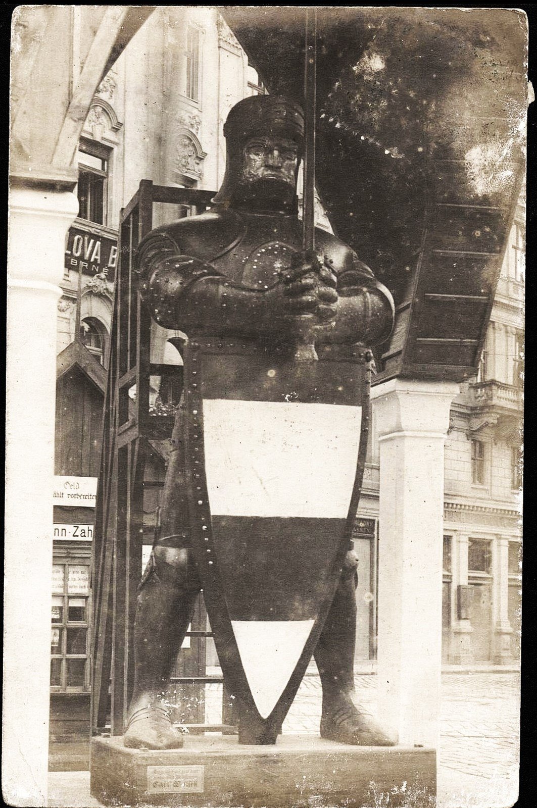 Nejednalo se ale pouze o samostatnou dřevěnou sochu, ta se totiž nacházela ukrytá pod ostře zahrocenou stříškou, na kamenném podstavci a po stranách měly stát dvě děla. Brněnský Wehrmann je popisován jako postava vojáka v plné zbroji v přilbici, rozkročená a opírající se vpředu o štít; u nohou sochy je znak Brna a silný dřevěný sloupek. Poblíž se samozřejmě nacházela pokladnička, a každý kdo do ní finančně přispěl, mohl vlastnoručně zatlouci hřeb s kulatou hlavou do sochy i stojícího sloupku. Méně movití občané pobíjeli hřeby železnými, smetánka pak stříbrnými a dokonce i zlatými. Různé spolky vytvářely celé obrazce, vojáci tam zavěšovali i svá vyznamenání. Výnosy sbírky byly určeny pro Fond válečných vdov a sirotků. JUDr. Hynek Bulín (jako očitý svědek) uvádí v Lidových novinách (27.10. 1928), že "z neděle 27.října 1918 na pondělí 28.října 1918 v noci uťali lidé Wehrmannovi přední díl hlavy a na její zbytek připevnili provolání Národního výboru, který nabádal k pokoji. Už den před tím vyrazila neznámá ruka brněnskému Wehrmannovi z rukou jeho strašlivý meč a v úterý (tedy 29.října 1918 - Menš) před půlnocí byla socha z náměstí odklizena". Wehrmann byl tedy od 30.října uložen a v roce 1919 rozhodlo město vrátit sochu autorovi. Protože však Carl Wollek v té době již v Brně nežil, zřejmě socha zůstala uložena neznámo kde. Děla z pomníku se nacházela ještě v roce 1922 ve starých jatkách na dvoře. V době nacistické okupace, po 15.3. 1939 (asi v dubnu 1939) byla však socha opravena a postavena nejdříve na dnešním Moravském náměstí u kostela sv. Tomáše před Místodržitelský palác (1939–1941), poté na Dominikánské náměstí do průjezdu Nové radnice. Definitivně byla odstraněna v roce 1945 a patrně zničena, jelikož další osudy nejsou známy. Brno tak přišlo o velice zajímavý pomník jedné éry. Níže se můžeme podívat, kterak vypadají jiné "pobité sochy" které se zachovaly až do dnešních dnů. Celý článek zde: http://palba.cz/viewtopic.php?f=93&t=7536