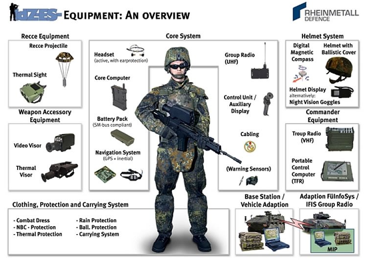 Německý program vojáka 21.století, známý pod označením IdZ - Infanterist der Zukunft "Gladius", pochází od společnosti Rheinmetall. První vzorky kompletů "vojáka budoucnosti" nebo jejich částí, byly testovány již na konci 90.let během války v Jugoslávii, přičemž se zde ukázaly jejich nedostatky a malá efektivita. Bylo tedy tedy rozhodnuto o pozastavení dalšího financování programu. Společnost Rheinmetall se sídlem v Brémách, na projektu pracuje od roku 2001, ale hlavní impulz pro aktivní vývoj se rozběhl až v roce 2002 po zapojení se Bundeswehru do operací v Afghánistánu. Prvních 15 prototypů kompletů IdZ bylo odesláno k otestování v roce 2004. Následně Bundeswehr objednal 2000 základních kompletů IdZ pro stejný počet vojáků, tedy nové uniformy, vybavení, základní elektronické systémy. V roce 2012 vznikla druhá generace označená jako IdZ-ES (Erweitertes System). Téhož roku získal Bundeswehr 900 kompletů IdZ-ES "Gladius". V polovině roku 2017 Bundeswehr objednal dalších 2460 kompletů za 370 mil.euro. Dodávky proběhnou mezi roky 2018 až 2020. Komplet IdZ-ES má veškeré klíčové systémy, jako komunikace, počítače nebo baterie umístěny v tzv. elektronické páteři - speciálním plochém batohu, mezi jehož hlavní funkce patří dodávky energie, zpracování dat ze senzorů, vizualizace všech informací, datové spojení s dalšími vojáky a vozidlem, navigace a řízení bojové činnosti. Na výklopném hrudním displeji nebo na přilbovém displeji, se zobrazuje pohyblivá mapa, pozice přátel/nepřátel, taktické informace, rozkazy a všechny další důležité údaje. Oproti dřívějším verzím celý komplet IdZ-ES váží pouze 3,9 kg (IdZ 4,5 kg) a díky modernější elektronice má o 30 % delší provozní dobu. Systém IdZ-ES je plně kompatibilní s vozidly Boxer a Puma. Systém řeší propojenost vozidel s jednotkami na úrovni čety. Vozidla nezajišťují jen transport, ochranu a palebnou podporu vojáků, ale jsou také pro vojáky komunikačním, datovým a energetickým centrem. V případě kontaktu s nepřítelem, tak může velitel výsadku sám převzít kontrolu nad zbraňovou stanicí vozidla. Obraz ze zaměřovací optiky zbraně uvidí přímo na obrazovce svého tabletu. Komplet IdZ-ES obsahuje tyto podsystémy: