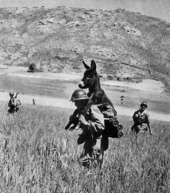 V červenci 1958, během bojů v Alžírsku, nedaleko města Jebel nalezli vojáci francouzské cizinecké legie zuboženého oslíka, který umíral hlady. Podělili se s ním o vzácnou vodu, vzali jej s sebou na základnu, kde jej nakrmili. Bambi se rychle stal maskotem 13e demi-brigade de Légion étrangère a miláčkem mnoha čtenářů. Fotografie rychle obletěla světovými médii a dojala mnoho lidí z různých států. Mezitím se neziskové organizace proti týrání zvířat (ASPCA a RSPCA) snažily vypátrat neznámého hrdinu, který oslíka odnesl na zádech a ocenit jeho rozhodnutí. Bohužel legie se rozhodla vojákovu identitu nezveřejnit, tak uznání získala celá třináctá půlbrigáda. Některé zdroje tvrdí, že onen voják byl "Harka", tedy domorodý Alžířan bojující na francouzské straně. Noviny Daily Mirror 16. února 1959 přinesly informaci, že Bambi byl zachráněn celou jednotkou, která si jej zamilovala. Po dlouhé zimní hlídce si užíval dovolenou na základně v Sidi Bel Abbès (سيدي بلعباس). Bambi prý dostal jméno pro své přitažlivé oči a vojáci se hádali o to, kdo bude jeho strážcem. Během pěších misí na něj vojáci často čekali, ale jeho vrtochy rádi promíjeli. Rychle si zvykl na vojenskou stravu a odmítal jíst zvířecí krmivo. Byl tedy oficiálně přijat do legie jako vojín, čímž získal nárok na vlastní příděl. Bylo mu dovoleno chodit kamkoliv si usmyslel s výjimkou baru. Účastnil se několika výprav, ale začátkem roku 1959 získala jednotka vrtulníky a Bambi tak stabilně zůstal na základně. V poslední době se hodně šíří fejk, že jde o fotku z druhé světové války a vojáci nesou oslíka přes minové pole, aby náhodou neodpálil nastražené miny. To je ale hloupost.