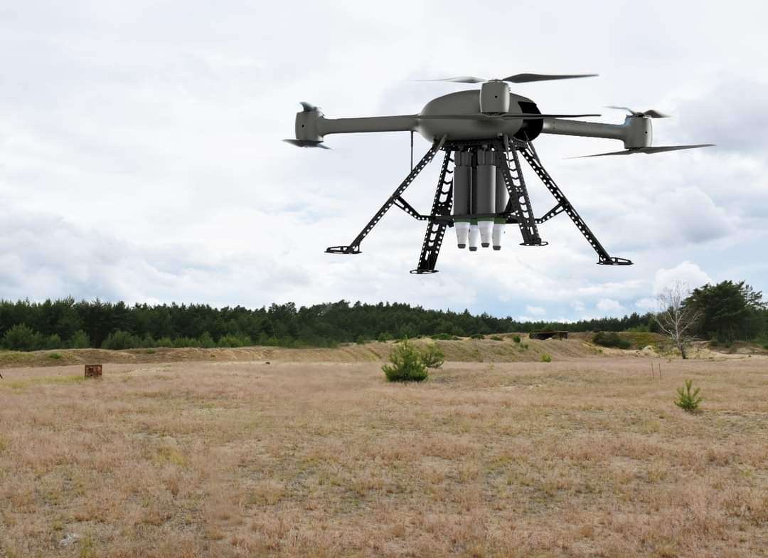 UAV BRUSMIN z dílny VTÚ. Nese 4x minometný granát ráže 60 mm, užívaný také Antos-LR.