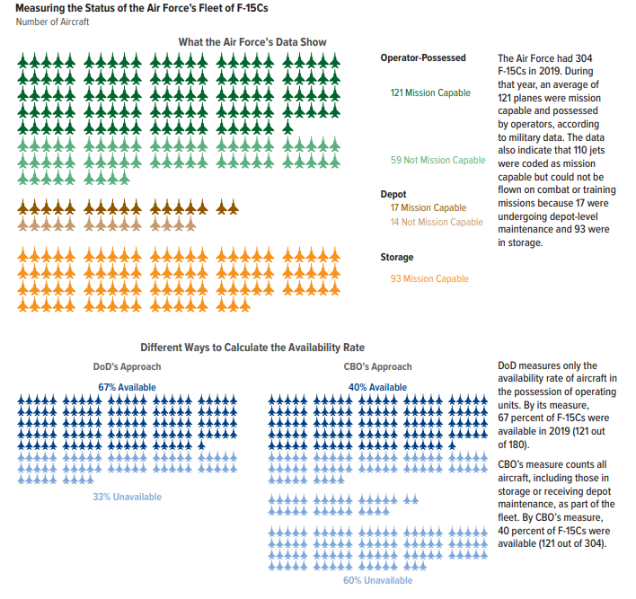 v držení provozních jednotek. Podle jejího měření, 67 % letounů F-15C bylo k dispozici v roce 2019 (121 z ze 180). Opatření CBO počítá se všemi letouny, včetně těch, které jsou v ve skladu nebo v přijímacím skladu v rámci údržby, jsou součástí