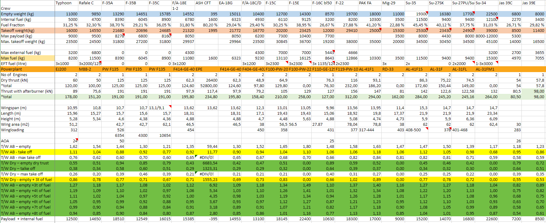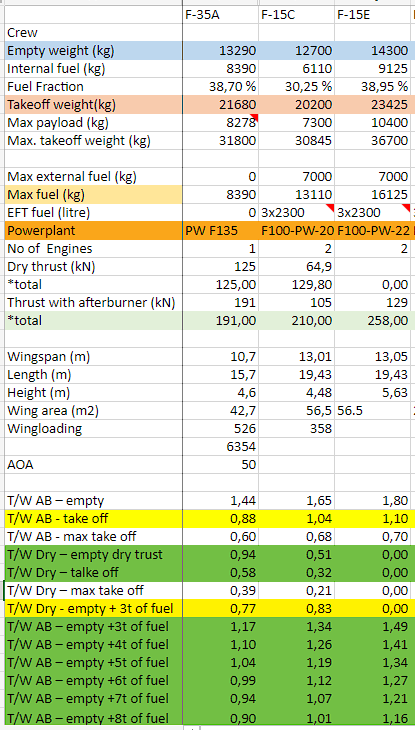 F-15C je naopak lehci, ale s 6t interniho paliva ma stejne T/W jako F-35 s polovinou nadrze.