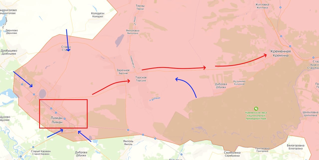 ▪️ Do půlnoci se AFU podařilo efektivně uzavřít Liman do kotle. Ze severu je obsazena Stavka, probíhají boje v Zarečnoje a trasa Liman-Torske je pod neustálou nepřátelskou palbou. Z jihu probíhá útok na Jampol.