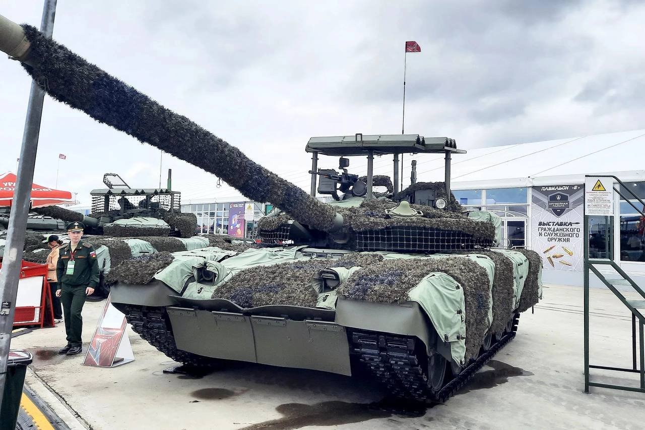 Tank T-80BVM vzor 2022 vybavený systémem snížení viditelnosti "Nakidka" a průmyslově vyráběným ochranným krytem na Mezinárodním vojenském technickém veletrhu Army-2023.