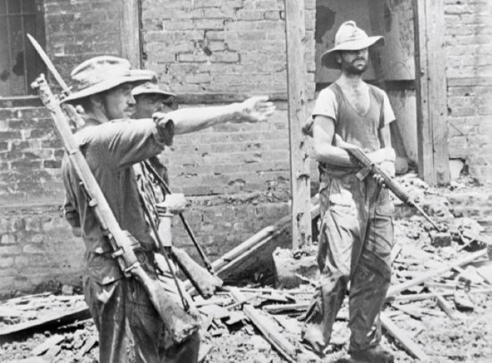 „Jediná možnost, jak se dostat dopředu, byla jít v zástupu. Terén znemožňoval používání vysílaček. Jediná možná komunikace byla verbální. Vojáci se prodírali dál. Namáhavý pochod je všechny velmi vyčerpával a navíc již bylo každému jasné, že zabloudili. Nakonec dal velitel rozkaz a celý prapor byl nucen strávit noc ve vlhké džungli. Po probdělé noci, během které nepříjemný déšť ani chvíli neustal, se Berkshirové dali opět na pochod. Narazili na dobře umístěnou japonskou pozici, ze které se na ně snesla přesně cílená palba, díky níž předsunuté čety ztratili skoro 90 procent svých mužů. Velitel se rozhodl k okamžitému ústupu, aby ochránil jednotku od dalších ztrát.“