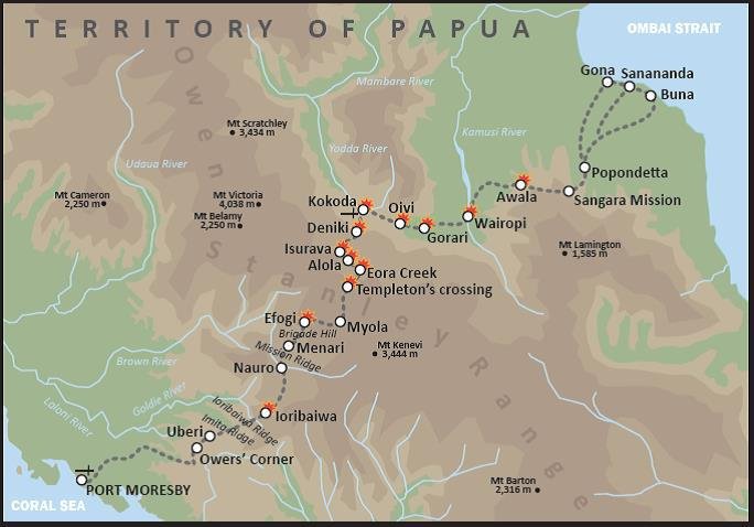 Zde viz mapu Papui, na které je vyznačena Kokodská stezka a to s místy japonského vylodění Gona, Sanananda a Buna a i s místy bojů. Mapa byla na několika webech a zde byla zmenšena.