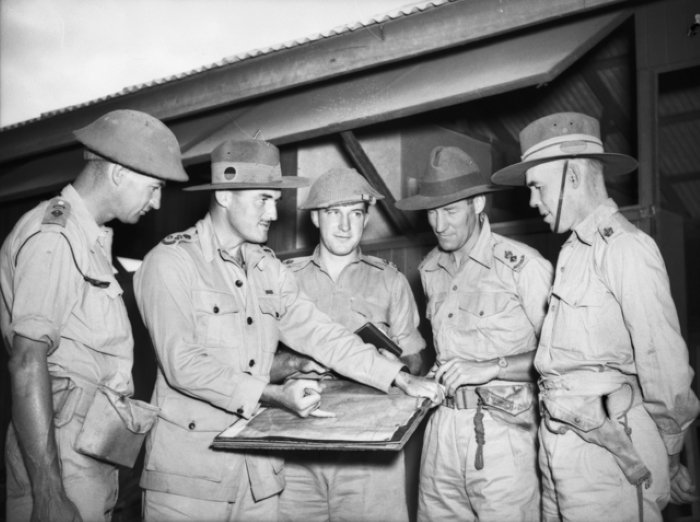 Důstojníci 30. brigády, červenec 1942. Zleva doprava podplukovník Owen Kessels ze 49. praporu, brigádní generál Selwyn Porter, major Norman Fleay velící jednotce Kanga, podplukovník William Owen z 39. praporu a jeho zástupce major J. Findlay. Foto je majetkem Wikipedie a zde bylo zvětšeno.