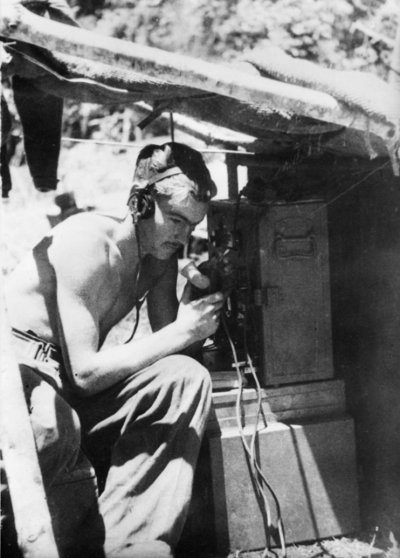 Ilustračně: Rádiová souprava obsluhovaná signalistou Jamesem Pashleyem na Kokodské stezce. Foto je majetkem Wikipedie, zde bylo zvětšeno.