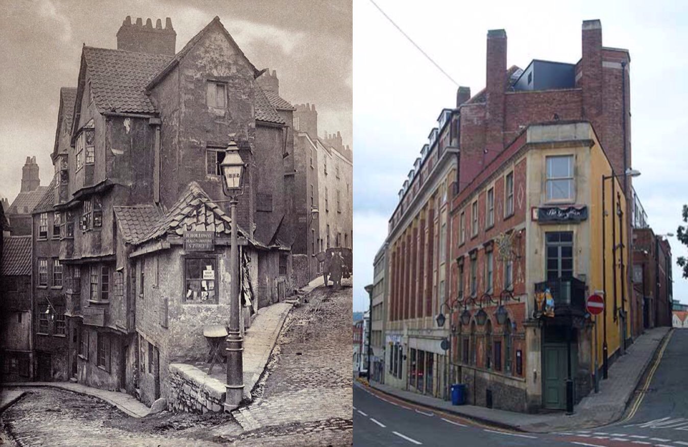 Křižovatka ulic Steep Street (nyní Colston St.) a Trenchard Street v anglickém Bristolu v roce 1866. Autorem je John Hill Morgan.
