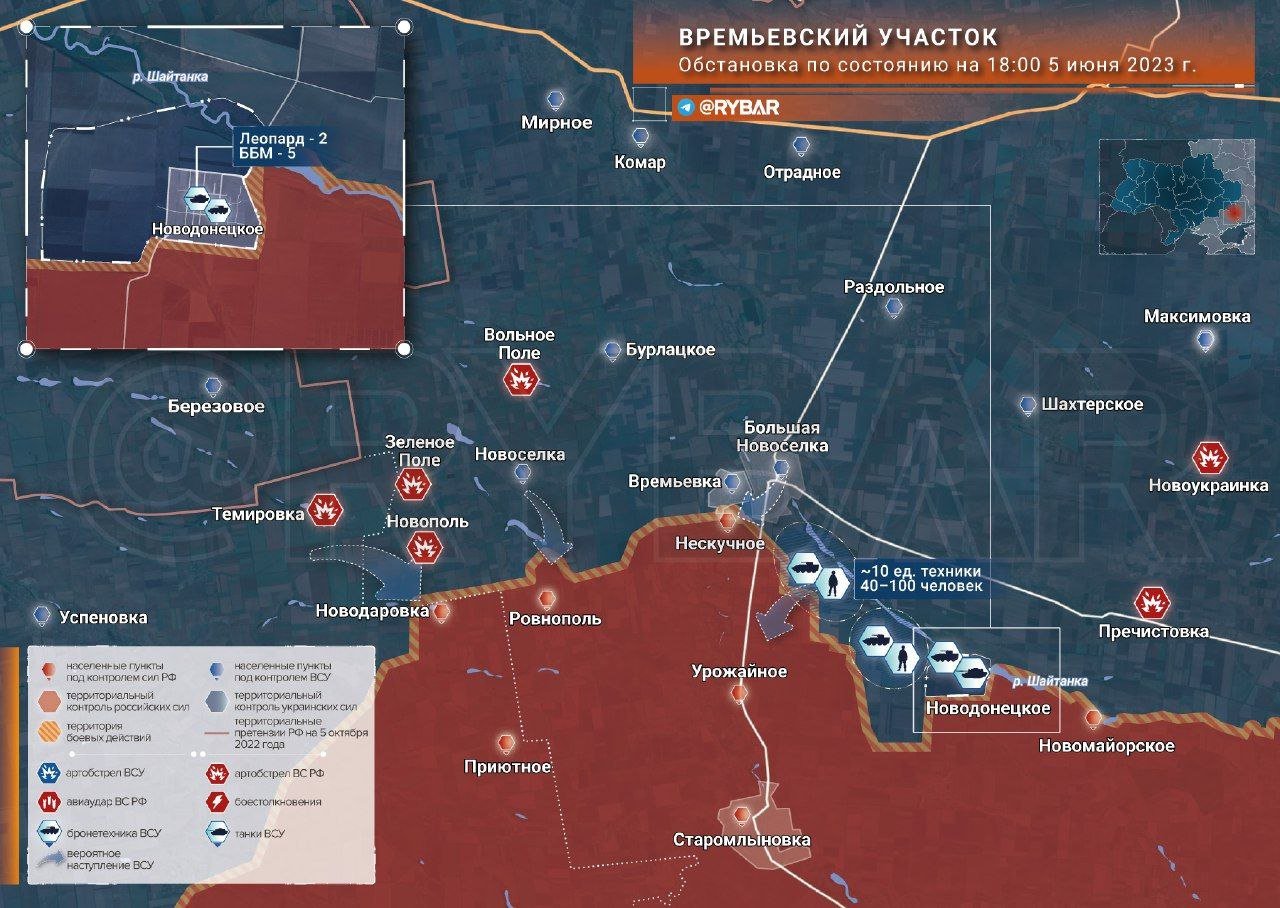 Východně od Vremjevského výběžku se obrněné skupině AFU podařilo vytlačit ruské jednotky z obce Novodoněckoje. Útok byl prvním případem, kdy ukrajinské formace použily německé tanky Leopard - v Novodoněcku jsou nyní dva Leopardy a pět MRAP.