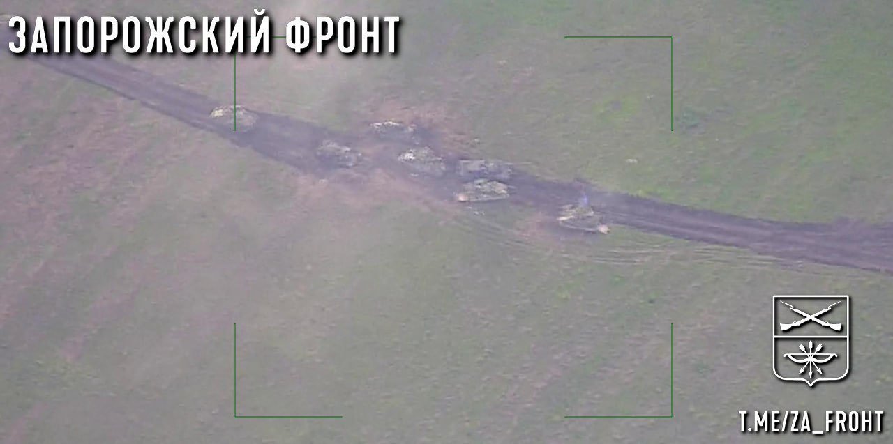 Poškozená a opuštěná technika kdesi v minovém poli, na frontě poblíž města Orichiv v Záporožské oblasti. Mělo by se jednat o techniku 47. mechanizované brigády a pokud to bude možné, vojáci je odtáhnou do zázemí k opravě. Na dalším videu je Leopard 2A4 s obdobným poškozením (přetržený pás a poškozená pojezdová kola), již po odtažení z bojové linie. Fotka s Leopardem 2A6, ženijní T-62 s odminovávacím zařízením a množstvím (4) opuštěných vozidel M2A2 Bradley ODS-SA (jeden zničený), má být ze stejné oblasti jako byla ona "zničená" technika na ruském videu (nevalné kvality) před pár dny - nejde tedy o další ztráty. Na Oryxu jsou momentálně 3 ztracené/poškozené Leopardy 2A6 (jeden zničený) a jeden 2A4. Na to že ofenzíva probíhá již třetí den, v otevřeném terénu, přes minová pole a bez letecké převahy, je to hodně slušný výsledek.