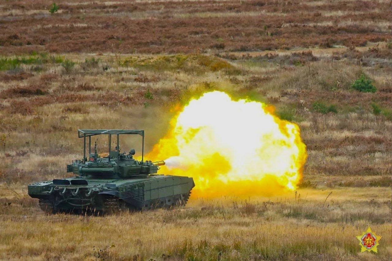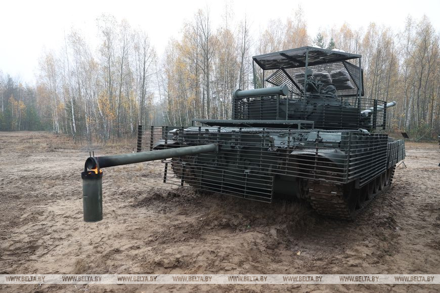 Poslední běloruská modernizace - tank T-72BM2, tedy T-72B s přídavným pancéřováním typu ERA, nový střelecký pozorovací systém Sosna-U a především mříž na vrcholku věže proti dronům, granátům nebo kamikadze dronům.