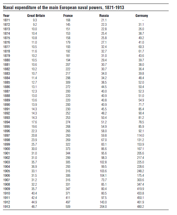 V této tabulce jsou námořní výdaje Velké Británie, Francie, Ruska a Německa v letech 1871-1913 v milionech liber, franků, rublů a marek. Začátkem 20. století se podle zlatého standartu 1 libra šterlinků dala směnit asi za 8 rublů. Z tohoto srovnání je zřejmé, že těch 1 875 000 liber, které bylo Rusko ochotné Chile zaplatit za lodě třídy Swiftsure pro ně byla vysoká částka, neboť jejich roční námořní rozpočty se tehdy pohybovaly kolem 100 milionů rublů (zhruba 12,5 milionů liber). Britské námořní výdaje tou dobou činila asi 30 milionů liber, takže tam se nejednalo o tak horentní sumu.