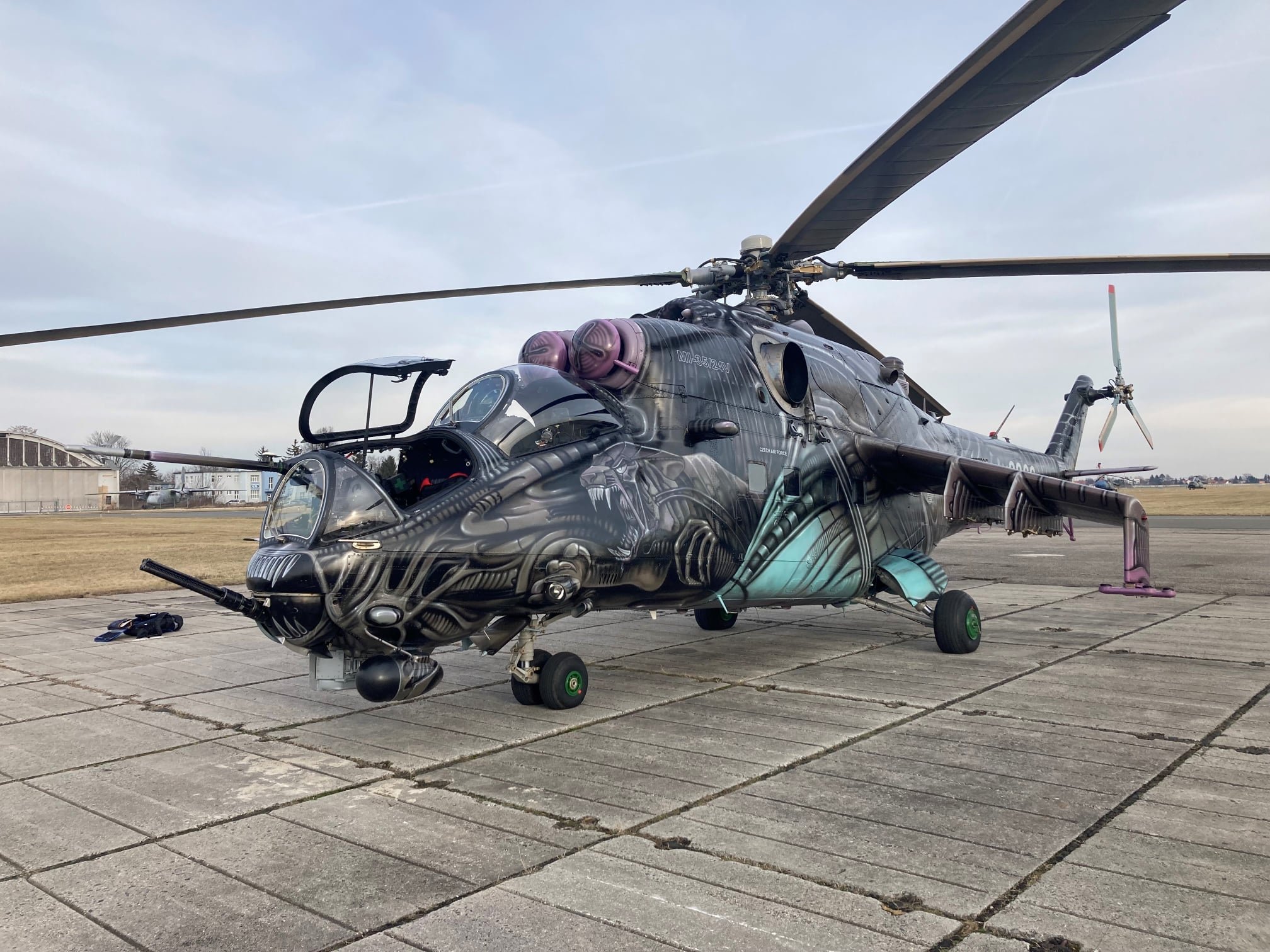 Poslední let čtyřech českých bitevních vrtulníků Mi-24V před cestou na Ukrajinu. Zajímavostí je, že mezi nimi je i slavný "Alien Tiger" (č. 3366), jehož nástřik v lakovně LOM PRAHA vyvolal velký zájem nejen u leteckých fajnšmekrů.
