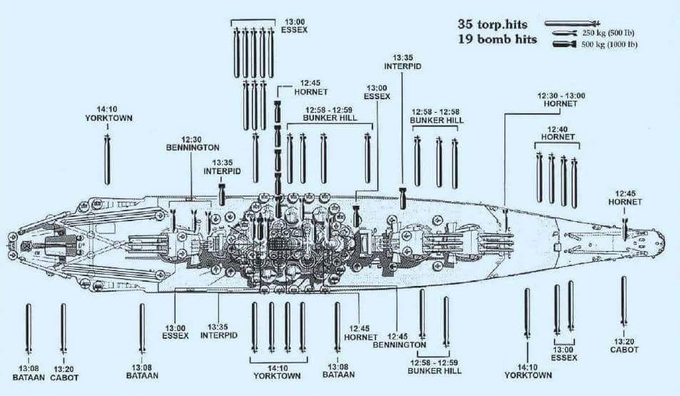 Tohle je asi nějaká internetová fantazie 35 torpéd! Ta možná byla vypuštěná, ale Musaši zasáhlo údajně jen 19. Jak už má obrázek Jarl výše.