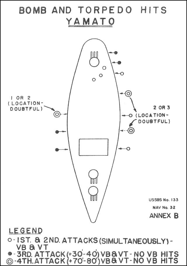 Já teprve minulý týden dokončil článek o potupení Musaši, takže Jamato zatím nastudovanou nemám, ale Novotný uvádí, že jí zasáhlo 10 torpéd a všechna do levoboku, načež se rychle převrátila a potopila. To zdá se nasvědčuje tomu, že Američané na základě předchozí zkušenosti opravdu soustavně útočili na jeden lodní bok.