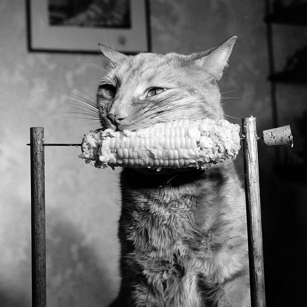 Kocour Nipper miluje kukuřici a podle jeho majitelky, Dorothy Brinn, spořádá každý den zhruba dva klasy. Kukuřici miluje již od kotěte a nejraději ji má s máslem. Pro snazší konzumaci mu ji zafixovali do speciálního stojánku. Toledo Blade - 12. července 1951. Autorem fotografií pro LIFE je Allan Grant.