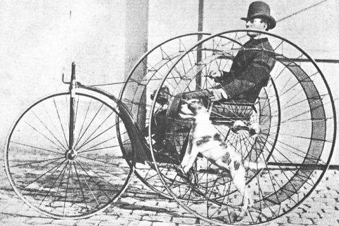 Koncem 19.století několik vynálezců představilo podivné velocipédy poháněné psy běhajícími v kolech. Na prvním snímku vidíme Cynophère patentovaný roku 1875 vylezcem M. Huretem z Paříže. Jednalo se o tříkolku, kdy přední kolo bylo řízené a dvě zadní kola byla poháněná domácími mazlíčky. Na druhém snímku vidíme velocipéd poháněný psy, který si roku 1870 patentoval F.H.C. Mey ze společnosti Buffalo Velocipede a třetí obrázek pochází z roku 1880. Již ve své době nebyly tyto vynálezy brány vážně, leč psů se používalo k tahání různých menších vozíků - jako na čtvrtém obrázku. Dodejme že v roce 1906 byla představena tříkolka v níž byl ukryt kůň běhající po posuvném pásu. Tato síla byla využita k pohonu samotných kol. Ani v tomto případě nedošlo k rozšíření. Snad se to příště podaří s křečky.
