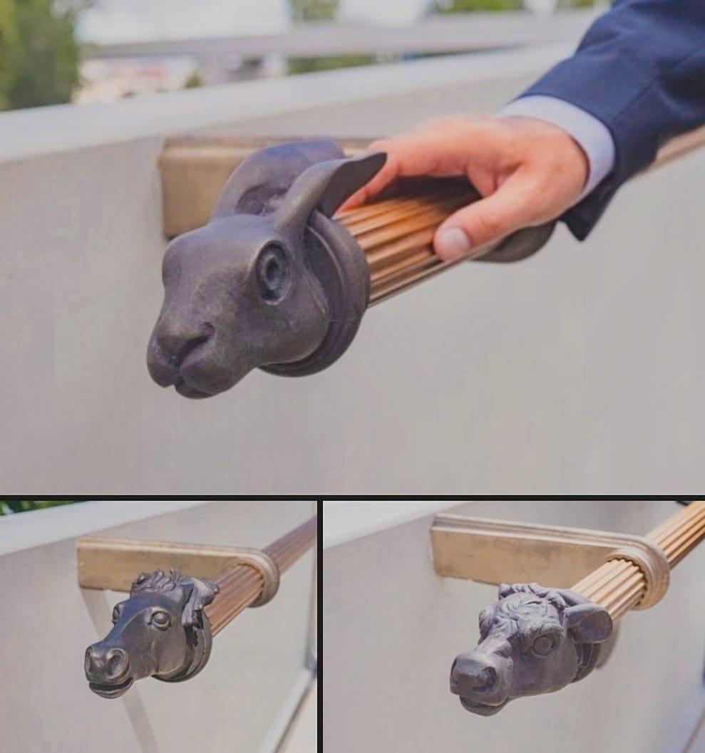 Najdeme zde velice zajímavou symboliku. Na holešovické straně, kde byl býčí trh, je hlava býčka. Na Štvanici, kde se pořádaly štvanice psů na zvěř, je hlava zajíce. A na karlínské straně, kde byla vozovna koňky, je hlava koně. Autorem těchto povedených plastik je Aleš Hvízdal.
