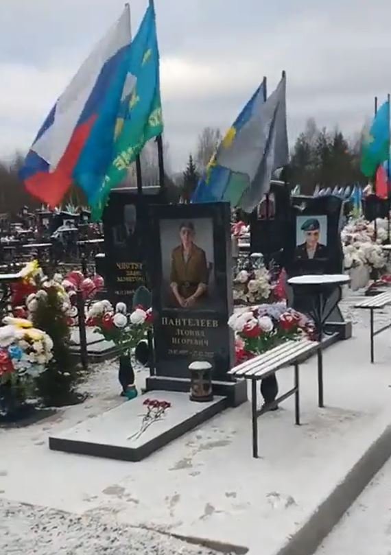 Komentovaná prohlídka hřbitovu ruské elity. Rus ukazuje hřbitov u města Kostroma, kde jsou pohřbeni mrtví Ruští vojáci z 331. pluku 98. výsadkové divize (VDV), kteří se zúčastnili bitvy o Hostomel na začátku války.