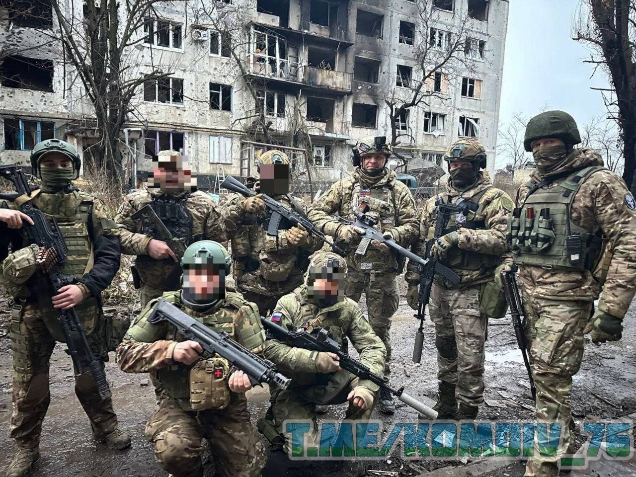 Příslušníci VDV kdesi v Bachmutu, se zajímavou sbírkou zbraní - AKMS, Vintorez a kořistní bullpup brokovnice od amerického výrobce Kel-Tec.